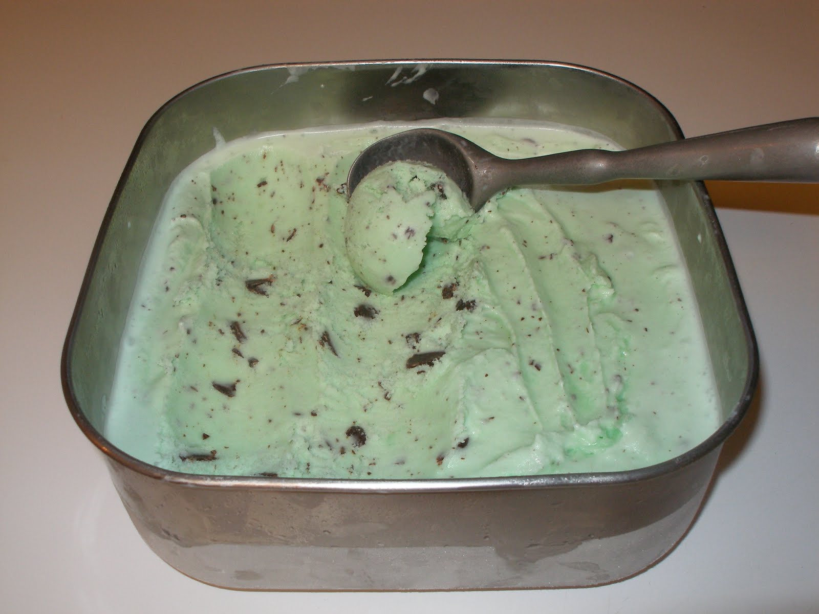 another one of my favorite ice cream flavors is mint chocolate chip. using my basic vanilla ice cream recipe, i omit the vanilla and substitute mint extract. once the mixture is ready for the ice cream maker, i add a couple of drops of Wilton green food color. in order to keep a light green color, only a very small amount is necessary. chopped dark ghirardelli chocolate is added after the mixture has processed for 25 minutes. the ice cream is frozen in a stainless steel container.